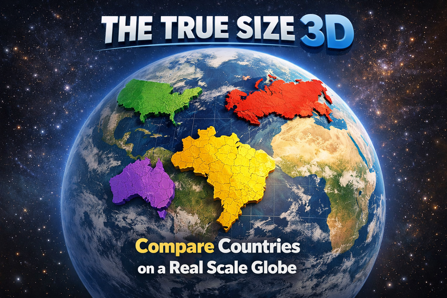 TheTrueSize3D is a free, interactive 3D globe that lets you compare the true size of countries and regions side by side. Inspired by The True Size Map, this tool removes the distortion of the Mercator projection by letting you drag and overlay country outlines directly onto a spinning 3D globe.